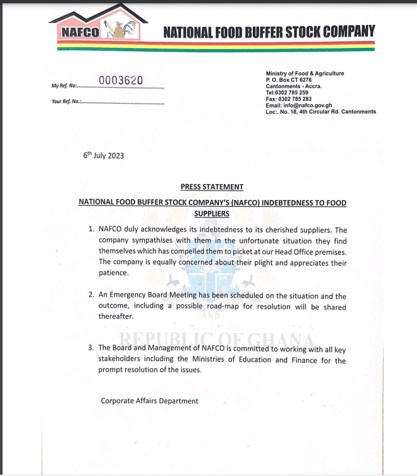 The National Food Buffer Stock Company (NAFCO) management has acknowledged its indebtedness to food suppliers, leading to the current picketing. In response, the company has announced an emergency board meeting will be held to address the issue.